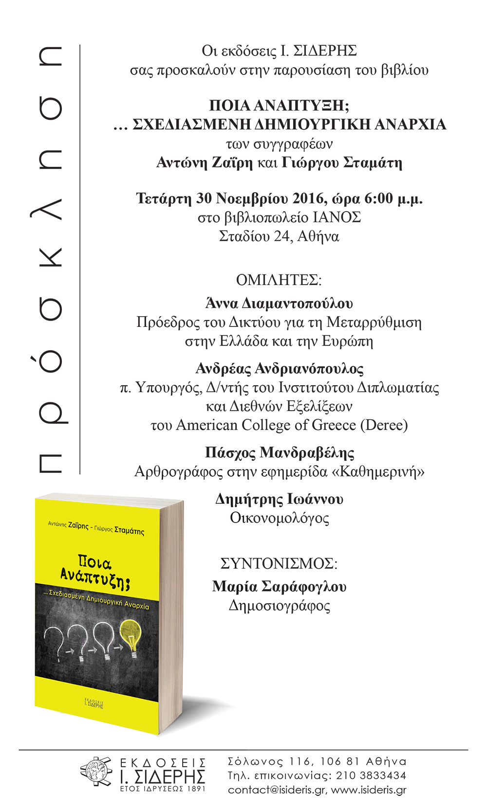 Οι εκδόσεις Ι. ΣΙΔΕΡΗΣ σας προσκαλούν στην παρουσίαση του βιβλίου "Ποια ανάπτυξη; ...Σχεδιασμένη δημιουργική αναρχία" των συγγραφέων Αντώνη Ζαΐρη και Γιώργου Σταμάτη, την Τετάρτη 30 Νοεμβρίου 2016, ώρα 6:00 μ.μ. στο βιβλιοπωλείο ΙΑΝΟΣ, Σταδίου 24, Αθήνα.
