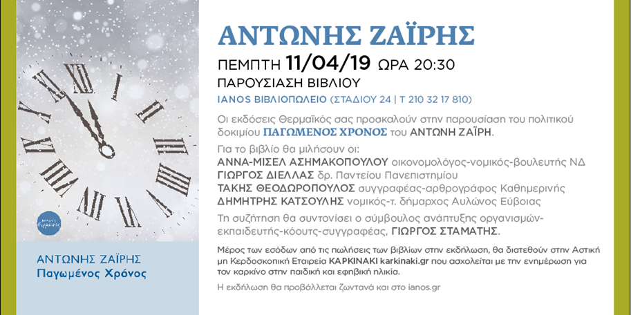 Οι εκδόσεις Θερμαϊκός παρουσιάζουν στον ΙΑΝΟ το πολιτικό δοκίμιο Παγωμένος χρόνος του Αντώνη Ζαΐρη. Για το βιβλίο θα μιλήσουν οι: